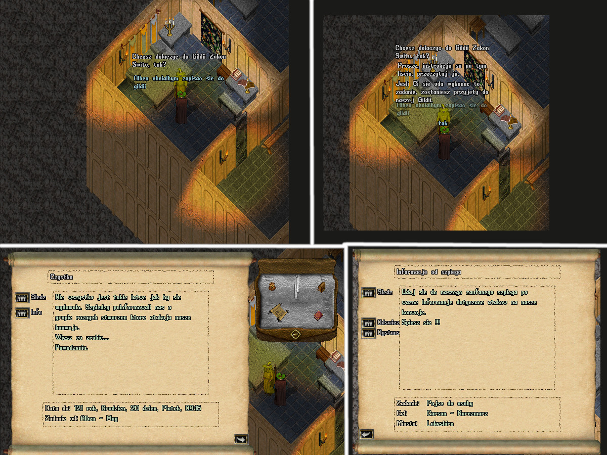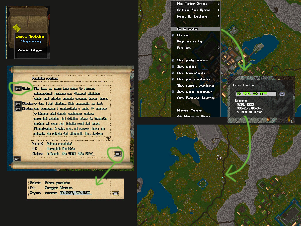 Wykonywanie zadań wiąże się z zazwyczaj udaniem do losowej lokacji lub lochu. Przycisk "Sledz" może pomóc znacznie, jako że wyświetli strzałkę kierującą nas do celu o ile jesteśmy na prawidłowej krainie. Ponadto dodany został przycisk, który pozwala zaznaczyć (Ctrl+A) oraz skopiować (Ctrl+C) koordynaty lokacji po czym można je wkleić (Ctrl+V) na minimapie ClassicUO (Go to Location) do wskazania dokładnej lokacji. Jeśli celem jest loch, to zostanie napisane jaki to loch oraz poziom a następnie strzałka pokieruje nas do wejścia do tego lochu.
