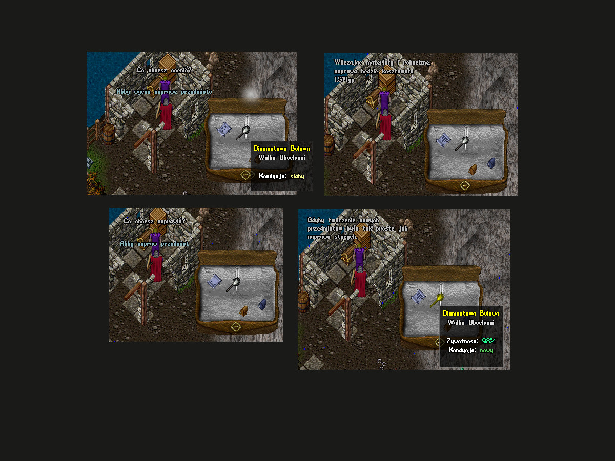 Zużyta broń zadaje mniejsze obrażenia. Zużyta zbroja daje coraz mniej punktów pancerza, a co za tym idzie mniejszą redukcję obrażeń. Wymagana jest naprawa raz na jakiś czas. Możliwa jest naprawa u odpowiedniego rzemieśnika w mieście. Płatnerz naprawi zbroję, Kowal broń itp. Każda naprawa zmniejsza żywotność, jednak można nadal naprawić na 100% do kondycji nowej. Zmniejszona żywotność oznacza, iż przedmiot będzie szybciej psuł się. Przy naprawie przez gracza kowala/płatnerza, żywotność spada wolniej lub czasem nawet w ogóle. Możliwa jest naprawa wszystkich przedmiotów w pojemniku lub na sobie. Należy powiedzieć zdanie z "napraw wszystko" oraz wskazać pojemnik lub siebie. Podczas naprawy kupiec zazwyczaj nie informuje o koszcie tylko pobiera odpowiednią ilość złotych monet. Jeśli nie mamy żądanej kwoty, to wtedy o niej powie. Jeśli chcemy poznać kwotę, to warto zapytać o wycenę jak widoczne na zrzucie powyżej. Poziomy zużycia: - nowy - uzywany - dobry - sredni - slaby - zuzyty - uszkodzony - kruchy