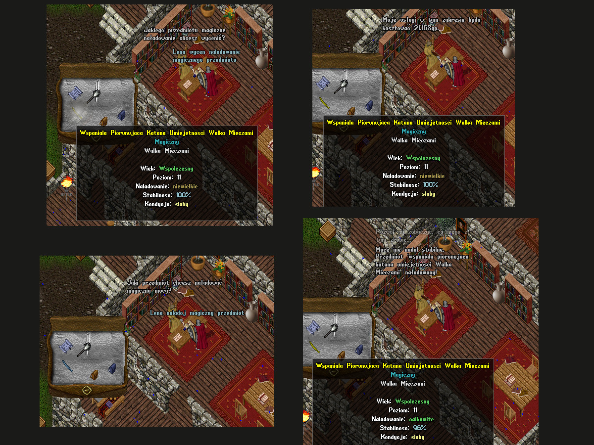 Podobnie jak w przypadku naprawy można wycenić naładowanie zanim przejdziemy do ostatecznego procesu. Umagiczniacz natomiast, aby naładować magiczny przedmiot potrzebować będzie kuli stabilności (do kupienia u maga) oraz kryształów lub magicznej esencji (2x). Obydwa te składniki musi położyć na ołtarzu, a przedmiot do doładowania na środku. Poziomy rozładowania: - calkowite - pomniejszone - spadajace - polowiczne - niewielkie - obnizone - zanikajace