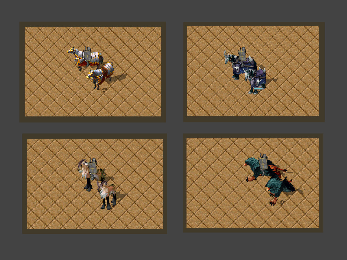 Dostępne wierzchowce to: Dostojny koń, Tygrysia koza, Nieumarła koza oraz Gryf. Zwierzaki te nie jadają równiez byle jakich jabłek, są bardziej wybredne. To co mogą zjeść jest zawarte w opisie nagrody u Rajcy. Nieumarła koza oczywiście nie słucha się każdego, a tylko wampira oraz nekromanty.