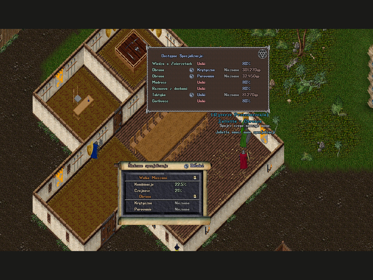 Na MW od jakiegoś czasu dostępny jest autorski system ataków specjalnych oraz kombinacji. Domyślnie postać walczy auto-atakiem, czyli macha bronią w tym samym tempie zadając stałe niskie nudne obrażenia. Autoataki zadają zaledwie 40% obrażeń, jakie postać może zadać używając ataku specjalnego. Dlatego też warto zacząć używać ataków od początku, mimo że nie będziemy mieli jeszcze skuteczności dużej. Po prostu postać będzie częściej nie trafiać, ale zada więcej obrażeń nadal oraz wzrost umiejętności jest szybszy przy wykonywaniu kombinacji. Po użyciu pierwszego ataku specjalnego, postać przestaje walczyć auto atakiem przez następne 60s. Dostępne ataki widoczne na zrzucie można podejrzeć po użyciu komendy .atak. Wywołać atak natomiast, można po użyciu komendy .atak 1 i tak do 4. Każda z walk ma inne ataki, jednakże są one podobne i są zawsze 4. Warto ustawić sobie makra w ClassicUO na kolejne ataki np Alt+1. Jak kto woli, jednak z Alt/Ctrl unikamy pisania po czacie. Poza tym w każdym momencie stwór może odejść lub możemy dostać paraliż, dlatego też najefektywniejsze jest budowanie kombinacji ręcznie. Na zrzucie można zobaczyć małe okno z kolejką wykonanych ataków. Wymagane jest, aby ostatnie ataki ułożyły się w kombinację i wtedy zostanie ona wykonana. Szansa na trafienie kombinacji zależy mocno od skuteczności oraz inteligencji postaci. W okienku aktualnych ataków widać również czerwony pasek. Jest to bardzo istotna informacja, ponieważ jest to szybkość wykonywanych następnych ataków. Może wzrosnąć, gdy posiadamy zbalansowaną broń lub po wykonaniu jednej z kombinacji na krótki czas. Szybkość zależna jest również mocno od posiadanej zręczności. Kombinacje natomiast są podobne dla każdej walki choć czasem różne. Dla łucznika są inne niż dla pięściarza lub wojownika z mieczem i tarczą. Warto przeczytać dokladnie opis, ponieważ każda kombinacja posiada dodatkowe efekty. Ponadto nie wszystkie kombinacje są widoczne od razu. Jak widać na zrzucie, liczniki wykonanych kombinacji są widoczne oraz następny pułap po "/". Po osiągnięciu pułapu odkryjemy nową kombinację.